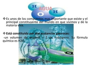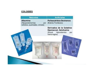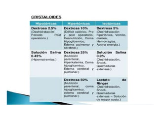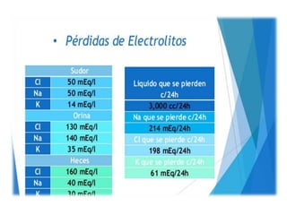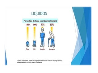 El documento resume la importancia del agua y los electrolitos en el cuerpo humano. Explica que el agua constituye el 60% del cuerpo y se distribuye en los compartimientos intracelular y extracelular. Los electrolitos como el sodio, potasio, calcio y magnesio se mantienen en niveles específicos a través de procesos como la osmosis y son esenciales para funciones vitales. Los déficits y excesos de electrolitos pueden causar trastornos como hipo e hipercalcemia, hipo e hip