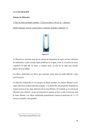 Este capítulo describe los procesos de purificación de agua y distribución de planta para el proyecto. El agua se someterá a sedimentación, filtración, carbón activado, luz ultravioleta y ozonificación para purificarla. Luego se envasará en botellones que serán lavados, llenados, tapados, etiquetados y almacenados. Se explican estos procesos y la distribución adecuada de equipos en la planta.