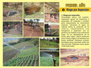 1) El documento describe los efectos del cambio climático en el Perú y la importancia de adaptarse a través de la cosecha de agua. 2) Se enfoca en la Sierra centro y sur del Perú, donde se concentra la mayor parte de la población rural pobre y los glaciares que alimentan los ríos. 3) Describe varios sistemas hidráulicos prehispánicos para captar agua de lluvia, deshielo y avenidas, como las Amunas de Huarochirí, que permiten infiltración para riego.