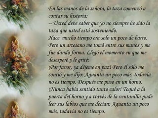 La taza cuenta su historia a la señora, explicando que pasó por un largo proceso de moldeado, horneado, pulido y pintado a manos del alfarero, lo que le causó mucho sufrimiento en el momento. Sin embargo, al final el alfarero la transformó en una hermosa obra de arte terminada. Al igual que la taza, las personas a veces deben pasar por sufrimientos que no comprenden, pero Dios las moldea para que salgan fortalecidas.