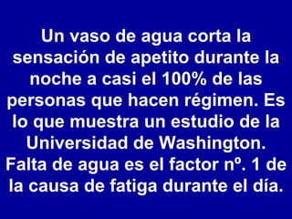 Un vaso de agua corta la sensación de apetito durante la noche a casi el 100% de las personas que hacen régimen. Es lo que muestra un estudio de la Universidad de Washington. Falta de agua es el factor nº. 1 de la causa de fatiga durante el día.