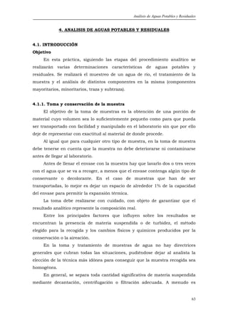 Este documento describe los procedimientos para el análisis de aguas potables y residuales. Explica cómo tomar y conservar las muestras de forma adecuada, incluyendo el uso de envases apropiados y la refrigeración para preservar la integridad de la muestra. También detalla los métodos para medir parámetros como la temperatura, el pH y determinar la presencia de cationes mediante técnicas como la absorción atómica y la cromatografía iónica.