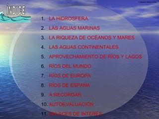El documento habla sobre los ríos y mares. Explica la hidrosfera, las aguas continentales como ríos, lagos y subterráneas, y las aguas marinas como mares y océanos. Describe algunos de los ríos más importantes del mundo y de Europa, así como los usos y aprovechamientos de ríos y mares.
