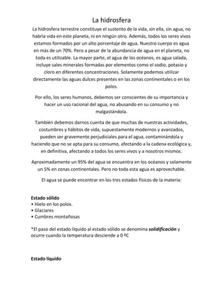Este documento describe las características de las aguas oceánicas y continentales. Resume que las aguas oceánicas son saladas y constituyen el 95% del agua del planeta, mientras que las aguas continentales son dulces y solo representan el 5% restante. También describe las propiedades físicas y químicas del agua oceánica, así como su movilidad a través de las olas, mareas y corrientes marinas. Finalmente, resume los diferentes tipos de aguas continentales como ríos, lagos