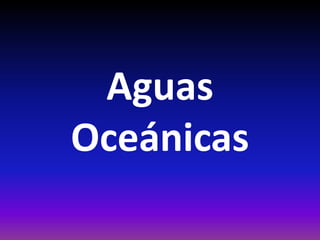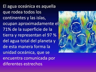 El agua oceánica ocupa aproximadamente el 71% de la superficie de la Tierra y representa el 97% del agua total del planeta. Se forma la unidad oceánica, comunicada por diferentes estrechos, y penetraciones llamadas mares, golfos y bahías en los litorales adyacentes. El origen de las aguas oceánicas fue el vapor de agua condensado de la atmósfera primitiva de la Tierra que cayó en forma de lluvia y dio lugar a los primeros océanos.