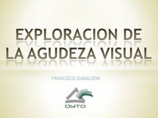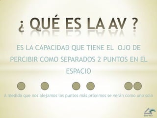 La agudeza visual (AV) es la capacidad del ojo para percibir puntos separados en el espacio, y se mide mediante diversos tests en visión lejana y cercana. Para evaluar la AV, se realizan pruebas a 6 metros o 33 cm, anotando los resultados para cada ojo, y se utilizan diferentes optotipos según la edad y comprensión del paciente. El uso del estenopeico puede ayudar a mejorar la visión en casos de defectos ópticos no corregidos.