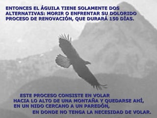 El documento describe el proceso de renovación que experimentan las águilas mayores de 40 años. Cuando sus garras y pico se vuelven inútiles para cazar, deben arrancarse el pico contra una pared y desprenderse de sus plumas viejas, un proceso doloroso de 150 días que les permite regenerarse y vivir 30 años más.