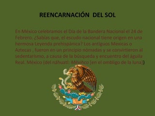 La leyenda azteca cuenta que los mexicas eran nómadas que se convirtieron en sedentarios después de seguir y encontrar un águila real. Siguieron las señales del águila durante más de cien años hasta que encontraron el lugar prometido, señalado por un águila parada en un nopal comiendo una serpiente, donde fundaron la ciudad de Tenochtitlán. El águila real se convirtió en un símbolo nacional de México que representa la reencarnación del sol y el orgullo del último emperador azteca Cuau
