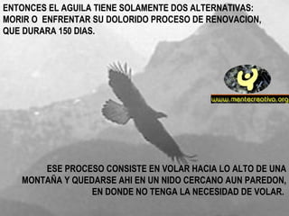 El águila vive hasta 70 años, pero a los 40 años debe tomar una decisión difícil: morir o someterse a un doloroso proceso de renovación de 150 días para renovar sus garras, pico y plumas desgastadas y volar de nuevo con fuerza renovada por 30 años más. De forma similar, a veces las personas deben resguardarse para desprenderse del peso del pasado doloroso a través de un proceso de renovación que les permita continuar con victoria renovada.