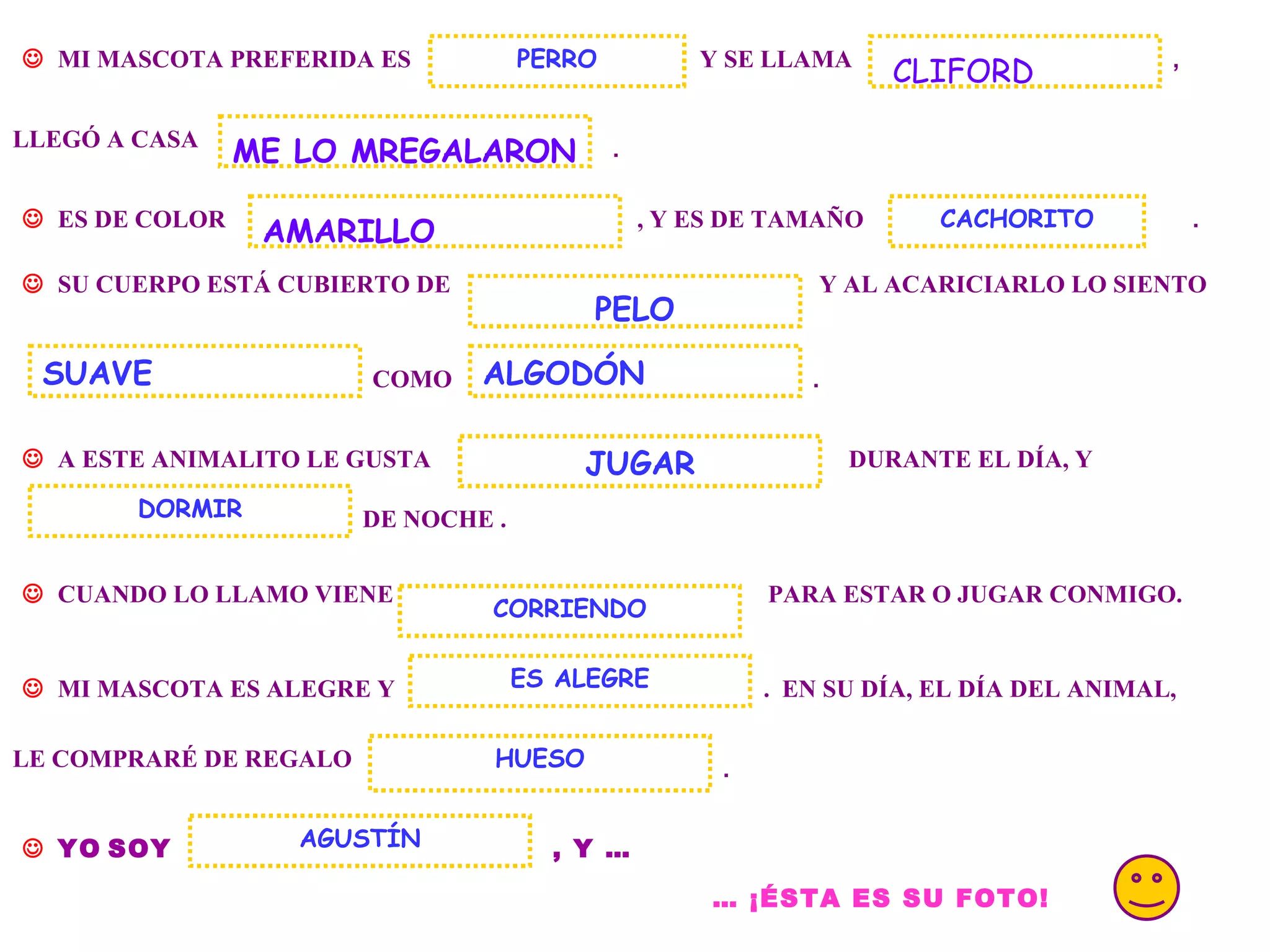 Agustín recibió como regalo un cachorro amarillo de pelaje suave llamado Cliford. Cliford le gusta jugar durante el día y dormir de noche, y siempre viene corriendo cuando Agustín lo llama para estar o jugar con él. Agustín dice que su mascota es alegre y que en el Día del Animal le comprará un hueso de regalo.