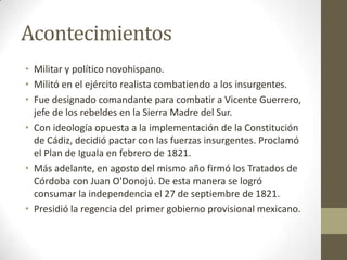Este documento describe la vida y carrera de Agustín de Iturbide, un militar y político novohispano que jugó un papel clave en la independencia de México. Primero luchó contra los insurgentes pero luego se unió a ellos y proclamó el Plan de Iguala en 1821, que declaró la independencia de México y estableció un gobierno monárquico constitucional. Más tarde fue coronado como el primer emperador de México pero fue derrocado en 1823 y ejecutado en 1824 después de regresar de su exilio.