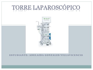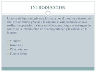 La torre laparoscópica está compuesta por un monitor, cámara, insuflador y fuente de luz. El monitor visualiza la imagen de la cámara. El insuflador controla la presión neumoperitoneo insuflando dióxido de carbono para crear un espacio quirúrgico. La cámara de alta resolución transmite las imágenes y la fuente de luz halógena ilumina la zona sin elevar la temperatura.