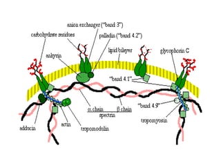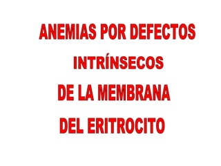 El documento describe diferentes tipos de anemias hemolíticas hereditarias causadas por defectos en la membrana eritrocitaria, incluyendo esferocitosis hereditaria, eliptocitosis hereditaria, piroquilocitosis hereditaria, estomatocitosis hereditaria y xerocitosis hereditaria. Estos trastornos se deben a mutaciones genéticas que afectan las proteínas de la membrana eritrocitaria y conducen a anormalidades en la forma, estabilidad, permeabilidad y funcionalidad de los eritrocitos.