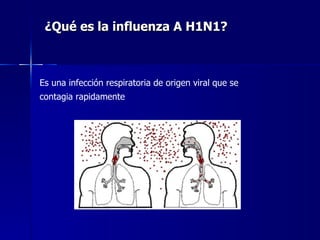 La influenza A H1N1 es una infección respiratoria viral que se transmite de persona a persona a través de gotas de saliva. Los síntomas incluyen fiebre, tos, dolor de garganta y dolores musculares. Se recomienda lavarse las manos frecuentemente, cubrirse al toser y estornudar, y acudir a servicios médicos solo si los síntomas empeoran.