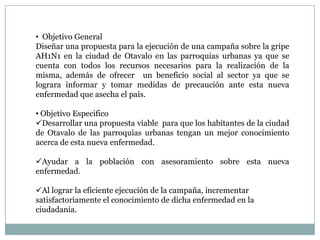 El documento presenta una propuesta para ejecutar una campaña de prevención de la gripe AH1N1 en Otavalo, Ecuador, con el objetivo de informar y asesorar a la población sobre la enfermedad y sus medidas de prevención. Se detallan metodologías que incluyen encuestas y entrevistas, así como el contenido educativo sobre síntomas, transmisión y prevención del virus. Se concluye que tomar medidas higiénicas y evitar aglomeraciones son cruciales para la prevención de contagios.