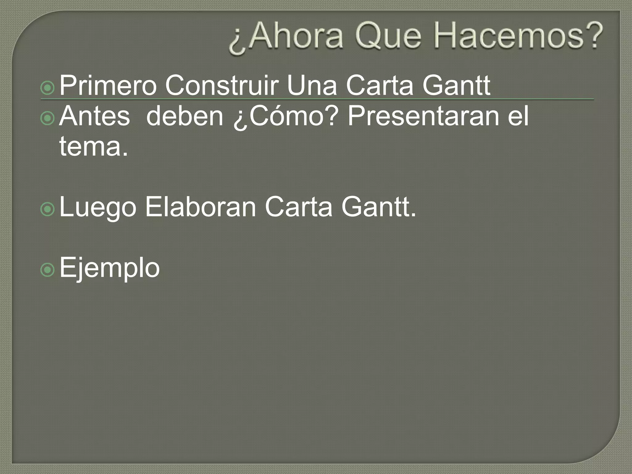 El documento presenta los pasos para crear una carta Gantt y socializar un trabajo de grupo de manera creativa sin una presentación tradicional. Incluye un ejemplo de carta Gantt con fechas, actividades, y roles de los estudiantes.