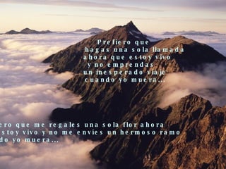 El documento expresa la preferencia de disfrutar de pequeños momentos con seres queridos mientras están vivos en lugar de grandes gestos cuando ya hayan fallecido. Se enfatiza valorar a las personas cercanas ahora que pueden compartir tiempo juntos, en vez de lamentarse después por no haberlo hecho cuando ya no estén.