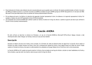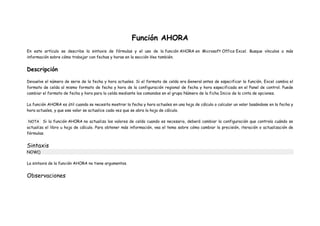 Este documento describe la función AHORA en Excel. La función AHORA devuelve el número de serie de la fecha y hora actuales. Se utiliza para mostrar la fecha y hora actuales en una hoja de cálculo o para calcular valores basados en la fecha y hora actuales que se actualicen automáticamente. La función AHORA no se actualiza constantemente, sino sólo cuando se realiza un cálculo o se ejecuta una macro que la contenga.