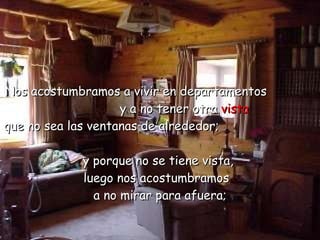 El documento describe cómo las personas se acostumbran a una vida rutinaria sin vivir plenamente. Se acostumbran a no mirar hacia afuera, a no disfrutar del sol y el aire, a comer y dormir apresuradamente sin aprovechar el día. Se acostumbran a esperar el fin de semana para descansar en lugar de disfrutar cada día. La vida pasa rápido y si nos acostumbramos a ahorrarla en lugar de vivirla plenamente, nos perderemos de experimentarla.
