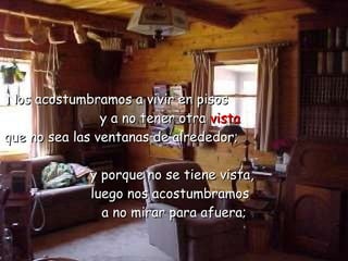 El documento describe cómo las personas se acostumbran a vivir apresuradamente sin disfrutar de la vida, olvidando vivir plenamente. Se acostumbran a no mirar afuera, a no abrir las cortinas, a encender la luz temprano y olvidan el sol, el aire y la amplitud. Se apresuran por las mañanas, comen rápido y duermen pesadamente sin haber vivido el día. Se acostumbran a esperar todo el día sin reunirse con otros y a sonreír sin recibir una sonrisa. Se conform