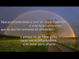 El documento describe cómo las personas se acostumbran a vivir en rutinas que les impiden disfrutar plenamente de la vida. Se acostumbran a no mirar hacia afuera, a no abrir las cortinas, a encender la luz temprano y olvidan el sol, el aire y la amplitud. Se apresuran por las mañanas y comen rápido, trabajan hasta tarde y duermen pesados sin haber vivido el día. Se acostumbran a esperar el fin de semana para descansar en lugar de disfrutar el presente. De esta forma, se