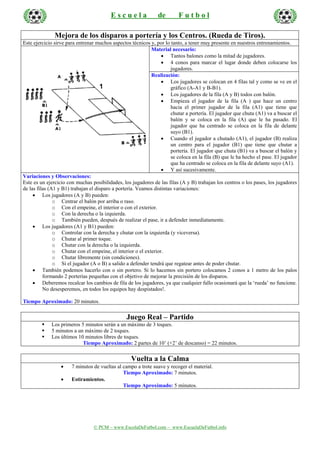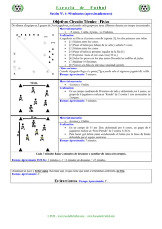 La sesión de entrenamiento de fútbol de 90 minutos incluye 3 circuitos técnico-físicos rotativos de 7 minutos cada uno, con tareas como slalom entre conos, saltar vallas y picas, flexiones y sprints. Luego, un ejercicio de 20 minutos mejora los disparos y centros en una "rueda de tiros". La sesión termina con un partido de 22 minutos y estiramientos.