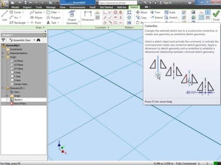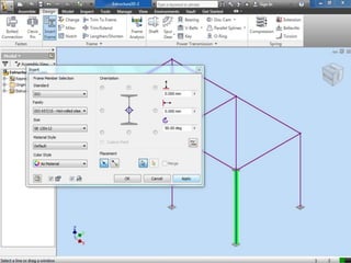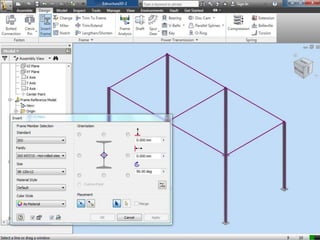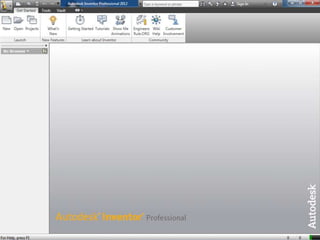 Autodesk Inventor 2012 (2013) es un software de diseño asistido por computadora que forma parte de la suite Autodesk junto con Autocad y Mechanical. El documento describe que Autodesk Inventor viene en varias versiones y se puede guardar en una carpeta en una unidad USB. Además, sugiere insertar un perfil y recortar todos los elementos de la estructura.