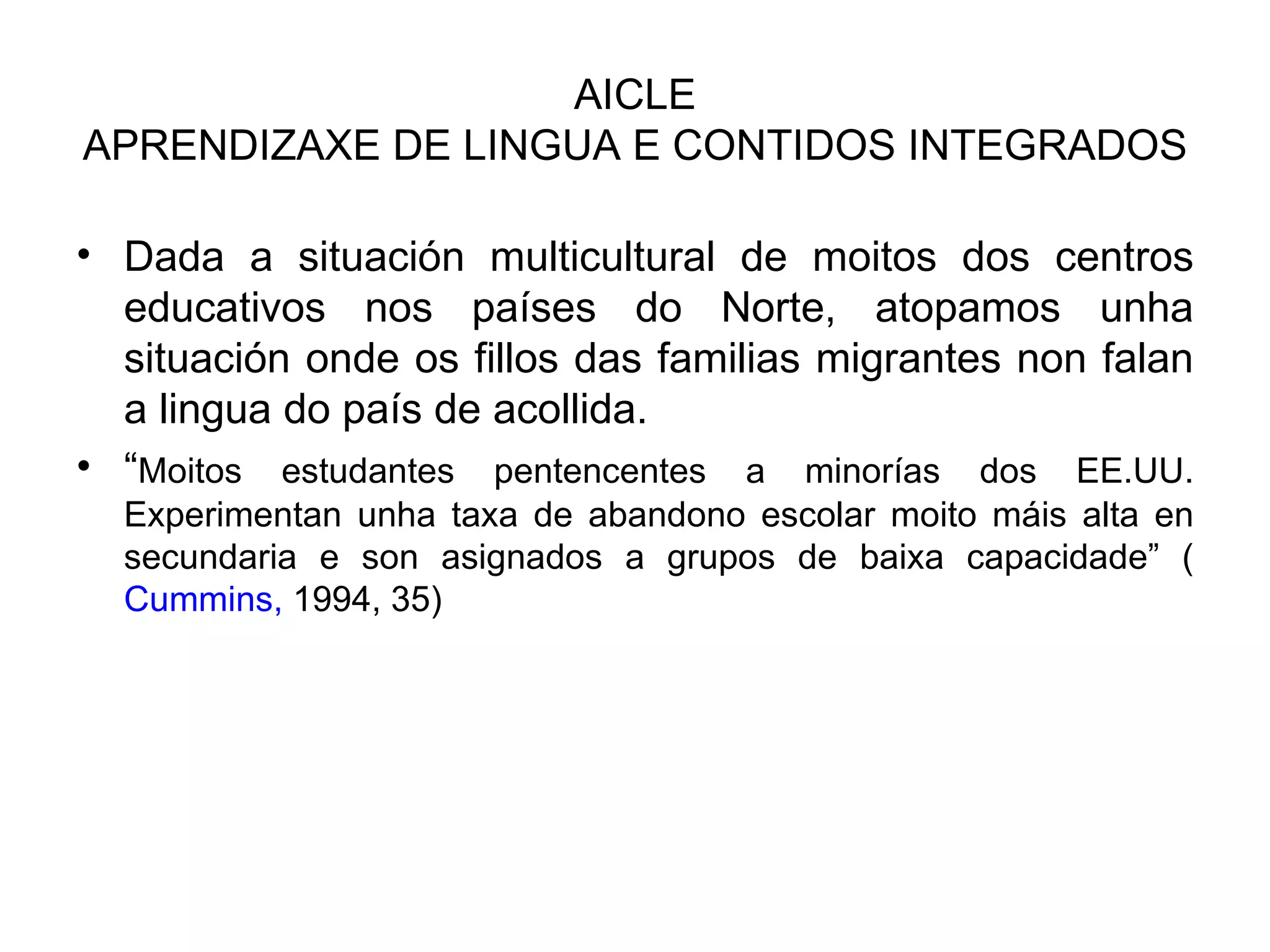 El documento habla sobre el método AICLE para la enseñanza de idiomas y contenidos académicos de forma integrada. Muchos estudiantes de minorías en países del norte no hablan la lengua local y tienen tasas más altas de abandono escolar. El método AICLE busca integrar la enseñanza de la segunda lengua con los contenidos académicos mediante la inclusión de contenidos relevantes de las asignaturas en las clases de idioma o haciendo las clases más sensibles a las demandas lingüísticas de las asignaturas