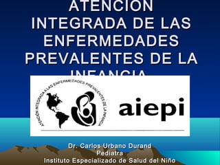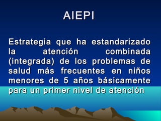 El documento describe la estrategia AIEPI para la atención integrada de las enfermedades prevalentes en niños menores de 5 años. Los objetivos de AIEPI son disminuir la mortalidad y morbilidad infantil mediante la detección temprana y tratamiento de problemas de salud, así como la promoción de la lactancia materna, alimentación e inmunizaciones. El curso enseña a identificar signos de peligro, clasificar enfermedades, decidir tratamientos y educar a madres sobre el cuidado de la salud de sus hijos.