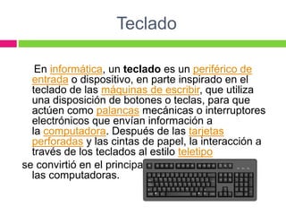El documento explica la función y organización de un teclado informático, describiendo sus bloques principales y distintas teclas que facilitan la interacción con la computadora. También aborda la mecanografía, ofreciendo consejos sobre la postura adecuada al teclear y una breve introducción a los sistemas operativos, especialmente el escritorio de Windows y su gestión de archivos. Finalmente, se detallan procedimientos para administrar archivos, crear carpetas y usar la papelera de reciclaje en el sistema.