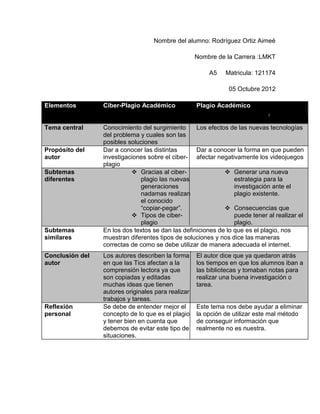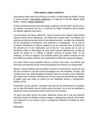 Este documento resume dos artículos sobre el ciber-plagio y plagio académico. Los artículos discuten los efectos de las nuevas tecnologías y cómo están afectando la comprensión lectora y el trabajo académico de los estudiantes. Ambos enfatizan la importancia de enseñar a los estudiantes a usar estas tecnologías de manera responsable y evitar el plagio.