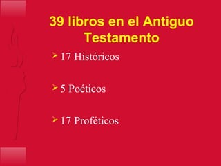 El documento resume la estructura y contenido de la Biblia. Indica que el Antiguo Testamento contiene 39 libros, divididos en 17 históricos, 5 poéticos y 17 proféticos. El Nuevo Testamento contiene 27 libros, incluyendo 4 evangelios, 21 cartas, 1 libro histórico (Hechos) y 1 profético (Apocalipsis). También proporciona detalles sobre los autores y el orden cronológico de los libros.