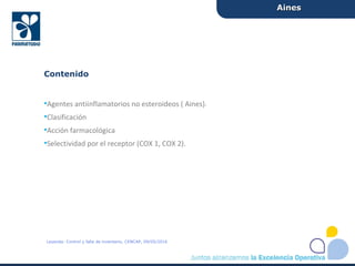 Los agentes antiinflamatorios no esteroideos (AINEs) son medicamentos utilizados para tratar la inflamación, el dolor y la fiebre. Pueden clasificarse según su estructura química o mecanismo de acción, y actúan inhibiendo las enzimas ciclooxigenasas 1 y 2. Algunos AINEs son selectivos para COX-1 o COX-2. Los efectos adversos comunes incluyen daño gastrointestinal, alteraciones renales y reacciones alérgicas.