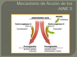 Los analgésicos antiinflamatorios no esteroideos (AINES) inhiben la síntesis de prostaglandinas, actuando como antiinflamatorios, analgésicos y antipiréticos. Algunos AINES como ibuprofeno, ketoprofeno y diclofenaco tienen buena acción antiinflamatoria, mientras que paracetamol, dipirona y ketorolaco son efectivos para el dolor. Además, paracetamol, aspirina y metamizol tienen buena acción antipirética.