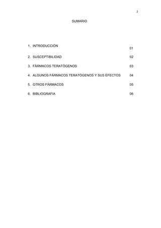 Este documento resume los efectos teratogénicos de varios fármacos. Explica que los fármacos teratogénicos pueden causar malformaciones fetales o efectos adversos en el feto. Detalla los períodos de mayor susceptibilidad y clasifica los fármacos en categorías de riesgo según la FDA. Describe los efectos de fármacos específicos como la talidomida, aminopterina y valproato de sodio. Finalmente, incluye una bibliografía de sitios web sobre teratogénesis farmacológ