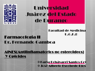 El documento proporciona información sobre diferentes medicamentos antiinflamatorios y analgésicos como el Aspirina, Acetaminofén, Diclofenaco, Ketorolaco e Ibuprofeno. Explica sus mecanismos de acción, indicaciones, farmacocinética, dosis, contraindicaciones, efectos adversos e interacciones. También describe el Metamizol Sódico, un analgésico perteneciente a la familia de las pirazolonas.
