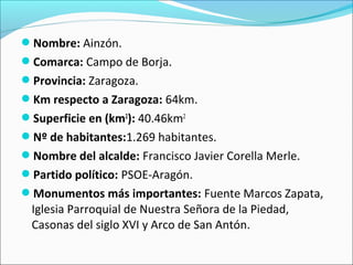 Ainzón es un municipio de 1.269 habitantes ubicado en la provincia de Zaragoza a 64 km de la capital. Algunos de sus monumentos más importantes son la Fuente Marcos Zapata, la Iglesia Parroquial de Nuestra Señora de la Piedad y el Arco de San Antón. Celebra sus fiestas patronales en honor a la Asunción y San Roque el 15 de agosto y a San Roque el 14 de septiembre, manteniendo tradiciones como el paloteado, las hogueras de San Antón y la romería del 18
