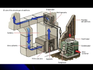 Calefacción, ventilación y aire acondicionado regulan las condiciones ambientales para hacer espacios más cómodos. Los sistemas incluyen chimeneas, calefacción radiante, calefacción por aire, y aire acondicionado. Los sistemas de aire acondicionado usan un ciclo de refrigeración para enfriar o calentar el aire, y son más eficientes cuando funcionan como bombas de calor al recuperar energía del exterior.