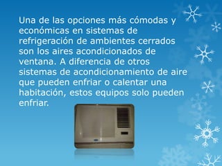Los aires acondicionados de ventana son una opción económica para enfriar ambientes cerrados. Funcionan mediante una bomba de vacío que extrae el aire caliente de la habitación para refrigerarlo y luego enviarlo de regreso. Son más fáciles de instalar que los sistemas de pared porque simplemente se colocan en una ventana sin necesidad de romper paredes.