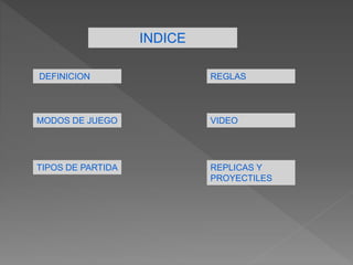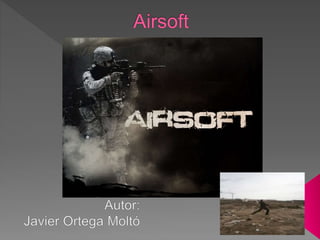 Este documento proporciona una introducción al airsoft, incluyendo sus modos de juego como equipo contra equipo y simulación militar, tipos de partidas como last man standing y deathmatch, reglas básicas de seguridad, y detalles sobre réplicas, proyectiles y tiendas de airsoft.