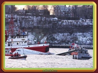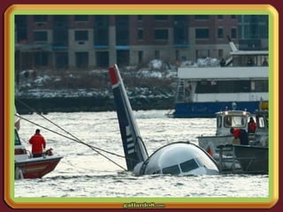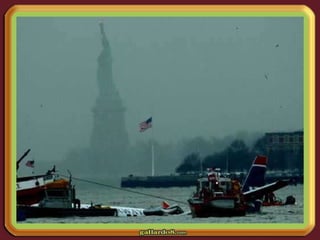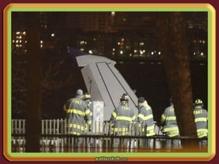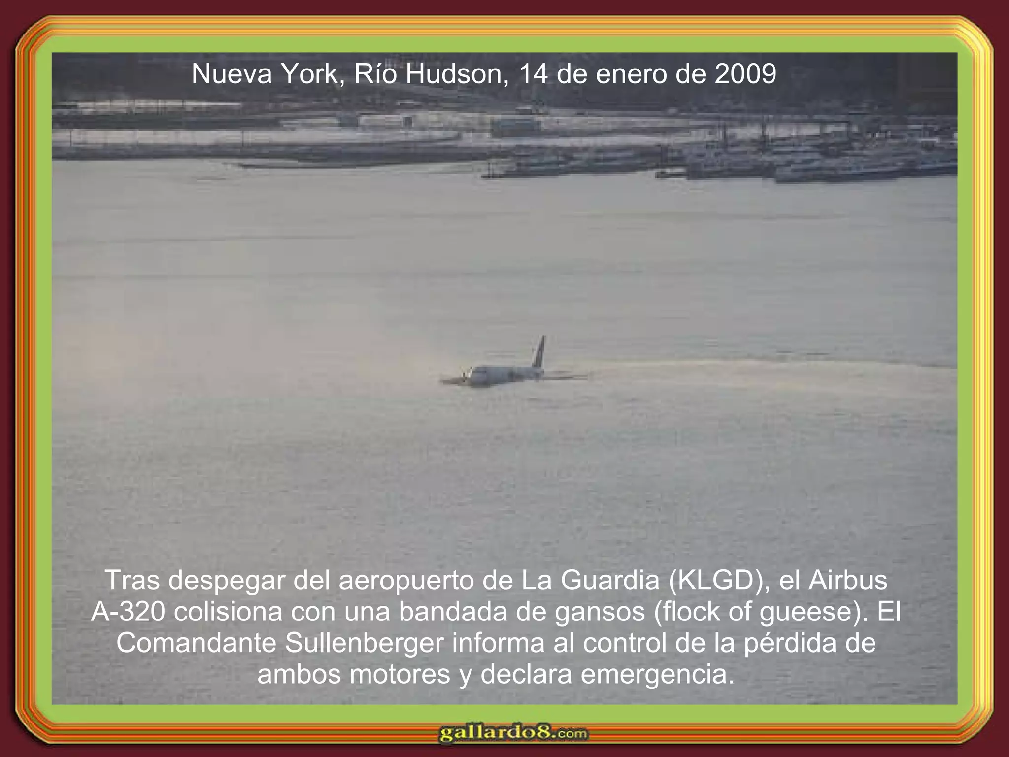 Un Airbus A-320 colisionó con una bandada de gansos tras despegar de La Guardia, lo que hizo que perdiera ambos motores. El comandante Sullenberger declaró emergencia y optó por amerizar en el río Hudson en lugar de regresar al aeropuerto, logrando un amerizaje exitoso a pesar de que sólo se desplegaron las rampas delanteras del avión.