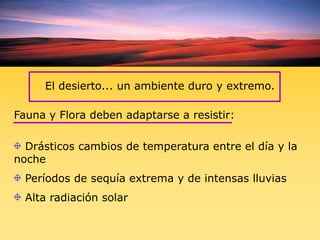 Este documento describe las adaptaciones de varias especies de arañas para sobrevivir en el desierto, incluyendo la construcción de refugios, comunicación sísmica y quimiotáctica, y estrategias reproductivas inusuales como la inversión de roles sexuales. Algunas especies como la araña lobo Allocosa brasiliensis exhiben comportamientos inusuales como que las hembras buscan a los machos y reciben sus cuevas luego de aparearse. Estudiar estas estrategias puede arrojar luz sobre las presiones evolutivas que moldean los roles
