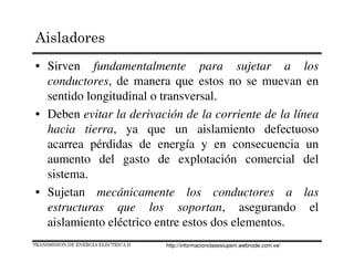 El documento describe diferentes tipos y materiales de aisladores eléctricos. Explica que los aisladores sirven para sujetar los conductores eléctricos y aislarlos eléctricamente de otras estructuras. Se clasifican según su material (vidrio, porcelana, plástico), diseño (de soporte, de suspensión, de tipo espiga) y uso (interior/exterior). También describe los materiales comúnmente usados como vidrio, porcelana y sus ventajas, y más recientemente compuestos plásticos.
