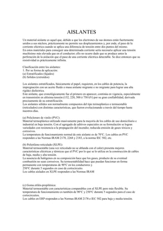 Este documento describe diferentes tipos de materiales aislantes térmicos y sus propiedades. Explica que los mejores aislantes son aquellos con baja conductividad térmica como el vacío, el aire seco, y materiales porosos o fibrosos que atrapan el aire. Luego detalla varios materiales comúnmente usados como aislamiento térmico como corcho, lana de vidrio, lana de roca y espumas, y proporciona detalles sobre sus densidades y coeficientes de conductividad térmica.