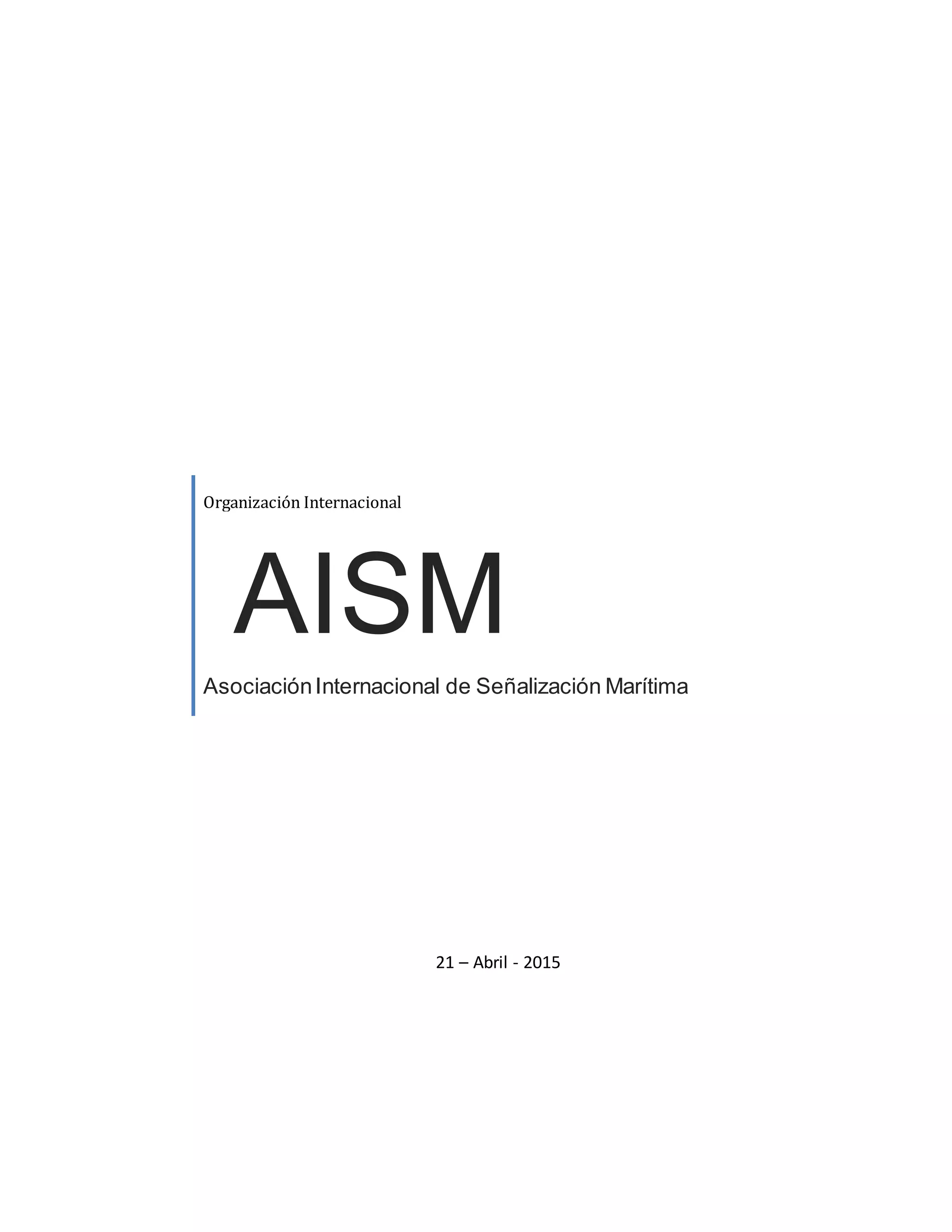 Este documento habla sobre la Asociación Internacional de Señalización Marítima (AISM), también conocida como la Asociación Internacional de Autoridades de Faros (IALA). La AISM establece estándares para el sistema de balizamiento marítimo a nivel mundial con el fin de mejorar la seguridad y eficiencia de la navegación. La AISM publica recomendaciones, guías y manuales sobre el diseño y funcionamiento de las ayudas a la navegación. También organiza conferencias para promover la cooperación internacional en materia de se