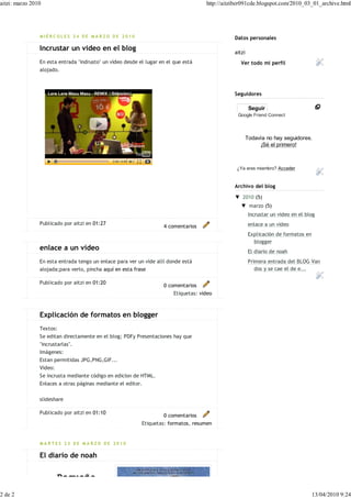 Este blog contiene varias entradas sobre cómo incrustar videos y enlaces en un blog de Blogger. La autora explica cómo insertar un video directamente desde su ubicación de alojamiento y proporciona un enlace de ejemplo. También resume los principales formatos que admite Blogger, como texto, PDF, presentaciones y medios incrustados mediante código HTML, así como cómo incluir enlaces externos.