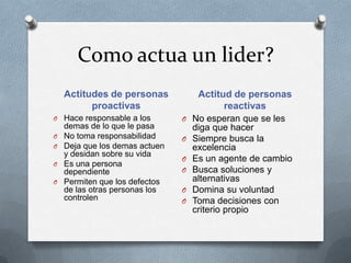 Un líder actúa de manera proactiva en lugar de reactiva, tomando responsabilidad y buscando soluciones en lugar de culpar a otros. Un líder inspira a través del ejemplo personal más que solo con palabras, y trabaja hombro a hombro con su equipo en lugar de dar órdenes como un jefe. La persuasión no es para hacer que otros hagan lo que uno quiere, sino para convencerlos de algo que puede beneficiarlos a ellos mismos.