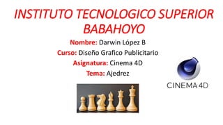 El documento presenta los pasos de un proyecto en Cinema 4D para crear una ilustración 3D de un tablero de ajedrez. Incluye imágenes que muestran las piezas de ajedrez antes y después de ser modeladas en 3D usando herramientas de Cinema 4D como extrusiones, selecciones de lados y ajustes de iluminación. El proyecto culmina con una imagen que muestra el tablero de ajedrez completamente renderizado.
