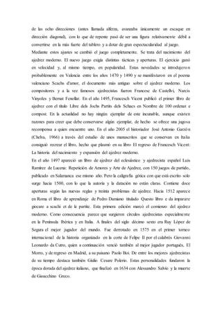 El documento resume la historia del ajedrez desde sus orígenes en la India hasta su llegada a Europa y su evolución hacia el juego moderno. El ajedrez surgió en la India como un juego de cuatro y se expandió a través del Imperio persa. Los árabes lo llevaron a su época de mayor esplendor antes de que llegara a Europa a través del Imperio bizantino y los varegos. Hacia finales del siglo XV, las reglas cambiaron decisivamente con modificaciones en los movimientos de peón, alfil y d