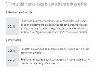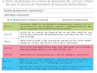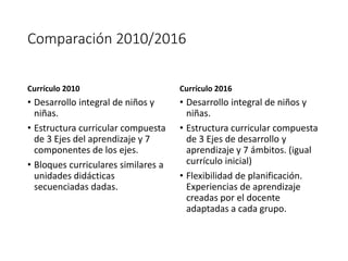 El documento compara los currículos de 2010 y 2016 de la preparatoria, señalando que ambos se enfocan en el desarrollo integral de los niños y niñas. El currículo de 2016 ofrece mayor flexibilidad en la planificación de experiencias de aprendizaje adaptadas a cada grupo, mientras que ambos evalúan el desarrollo de destrezas a través de criterios de desempeño. El documento también describe los ejes y ámbitos de desarrollo y aprendizaje, así como la carga horaria de las asignaturas en 1